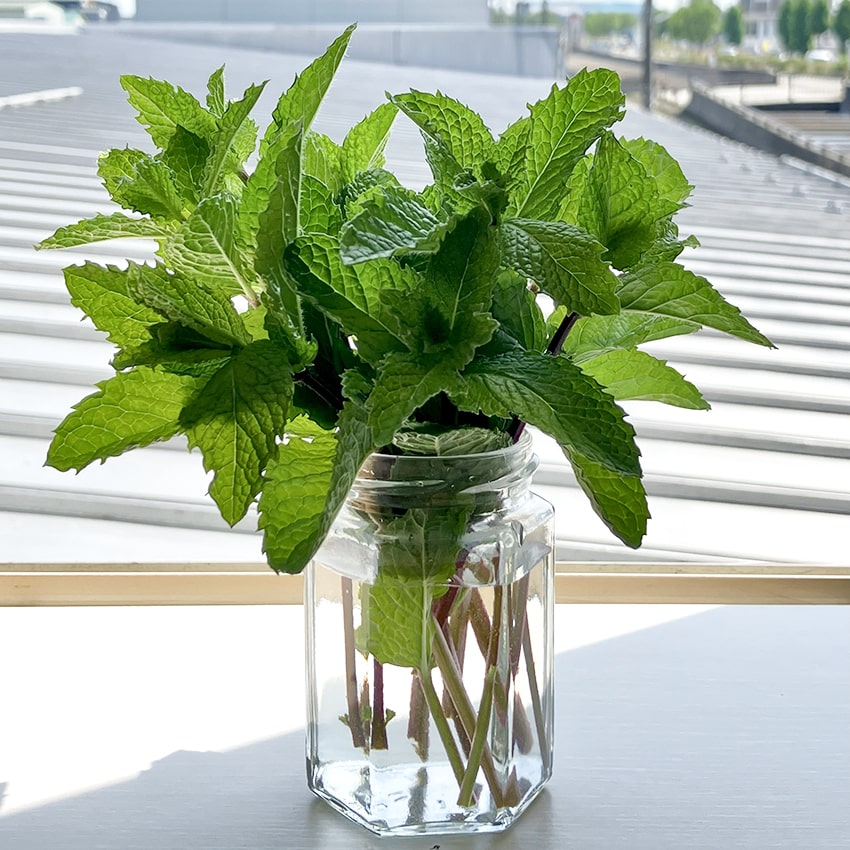 会社の敷地に群生していたミントくん。虫除けにもちょうどいいし早速摘み取って瓶に差し入れる。虫食いの葉っぱ発見。…虫除け効果とは🧐?