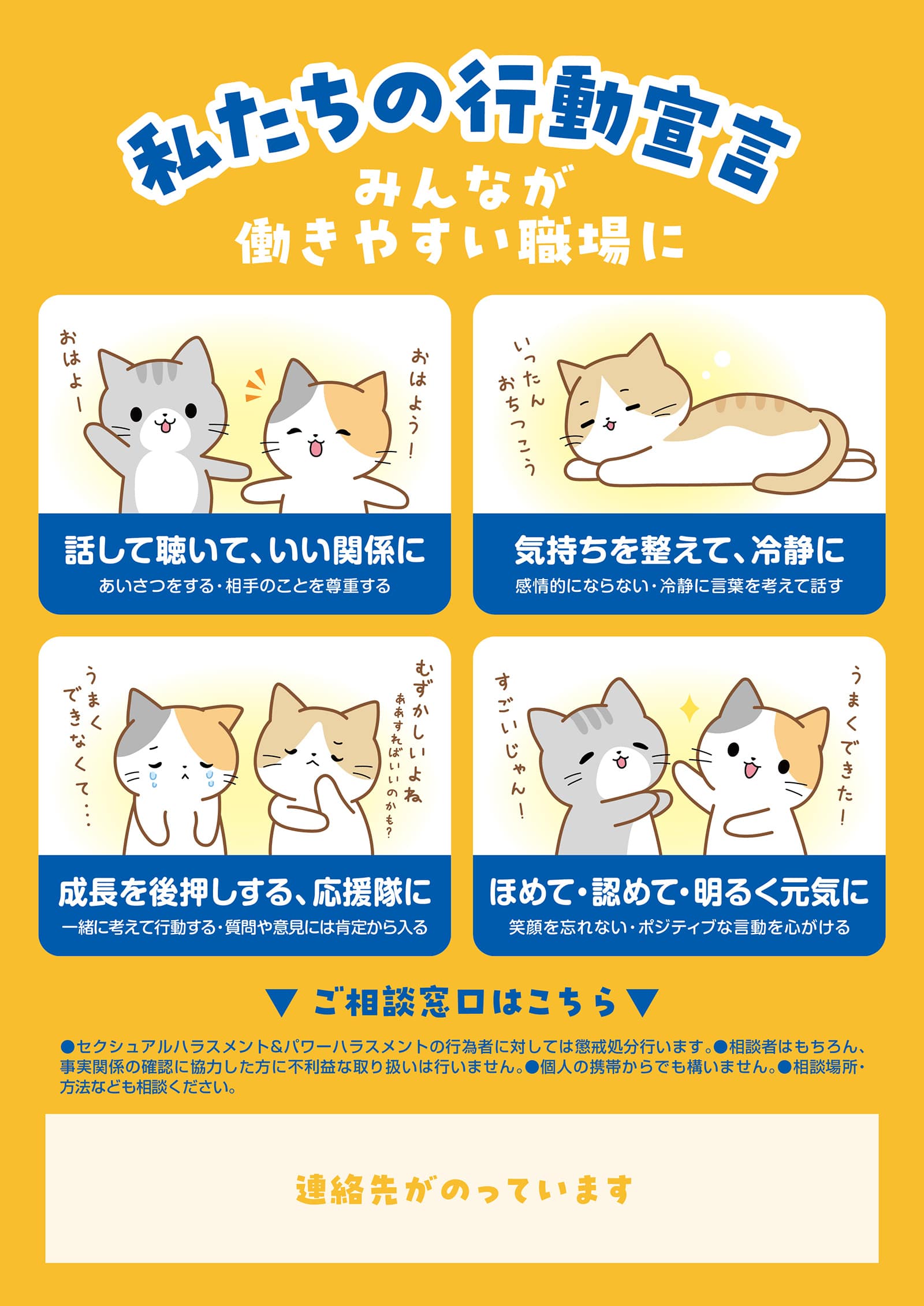 ハラスメント研修の際に、より良い職場を目指して社員のみなさんから書いていただいた【 私たちの行動宣言 】をもとに作成しました。あいさつなどのコミュニケーションをはじめ、自分の感情を上手にコントロールする(アンガーマネジメント)など、猫ちゃんたちがそれぞれの【 行動宣言 】を実践しています。みなさんも、ぜひ【 行動宣言 】を実践して、みんなで“よりよい職場”をつくっていきましょう🐾
