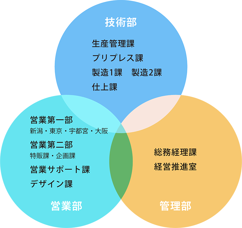 私たちは、新潟(三条市)に本社・生産工場を構え、新潟に生産機能を集約、東京・宇都宮・大阪に営業オフィスを展開しています。 各部門密接に連携し、情報を共有します。(下の図は、組織図を簡略化したものです。)